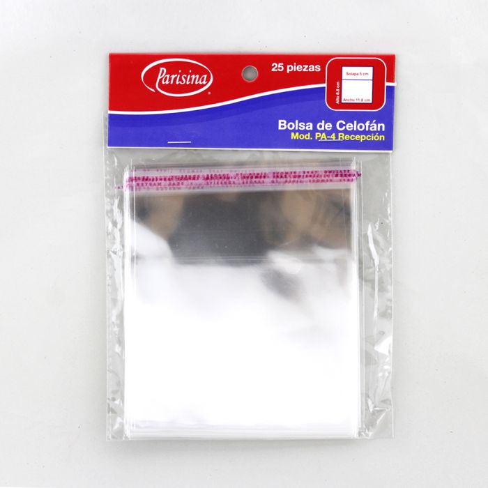 Caja con 50 paquetes de Bolsa de Celofán 11.8 x 8.8 cm solapa 5cm PA-4 Recepción con 25 pzs c/u