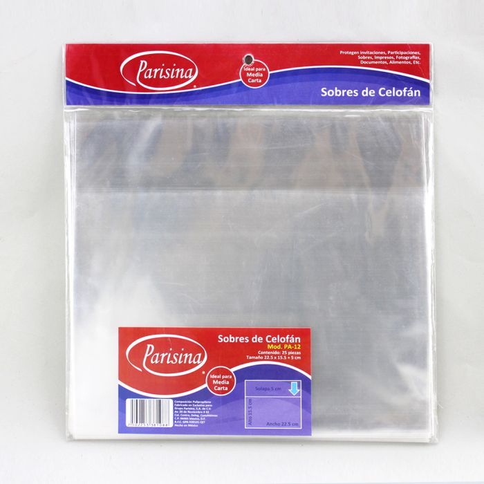 Caja con 50 paquetes de Bolsa de Celofán 22.5 x 15.5 cm solapa 5cm PA-12 1/2 Media Carta con 25 pzs c/u