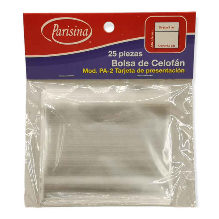 Caja con 50 paquetes de Bolsa de Celofán 9.5 x 5.5 cm Solapa 3 cm PA-2 Tarjeta de Presentación con 25 pzs c/u