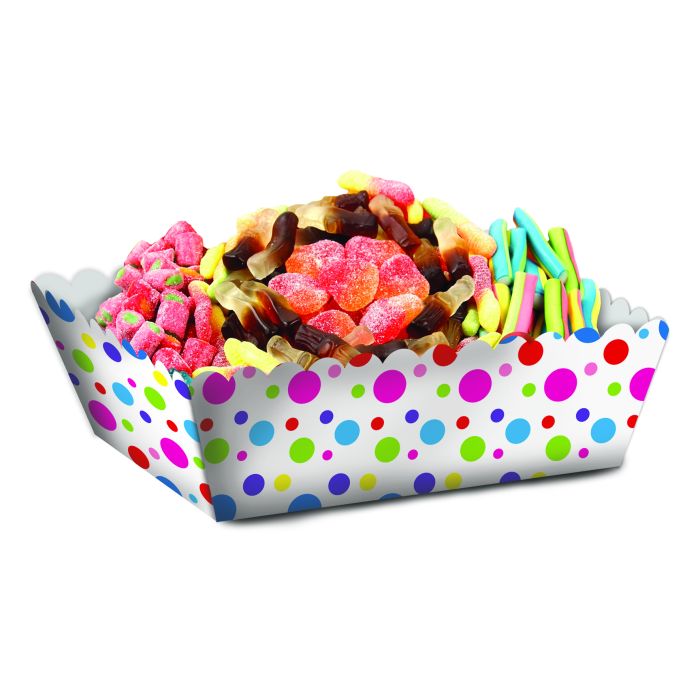 50 Paquetes de Charola Puntos Multicolor Tamaño:20.6 x 13.8 x 4 cm con 6 piezas c/u