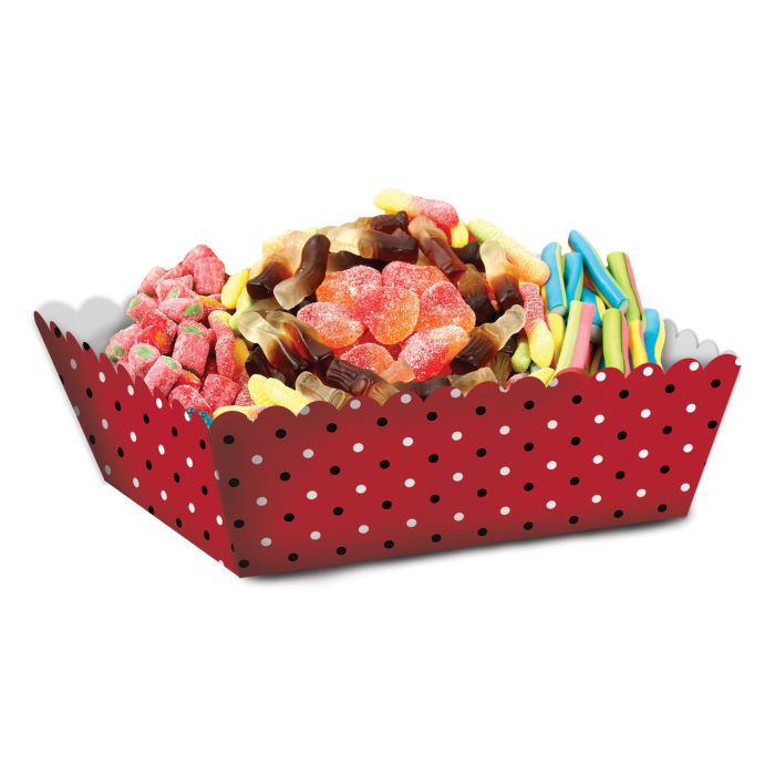 25 Paquetes de Charola Puntos Rojo Tamaño:20.6 x 13.8 x 4 cm con 6 piezas c/u