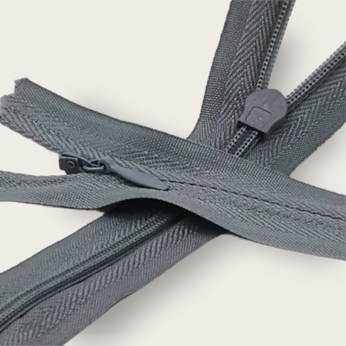 El cierre o cremallera de nylon es también llamado cierre de poliéster o cierre espiral. Los dientes están hechos de monofilamento y la cinta está hecha de hilo de poliéster. Este cierre tiene la mejor flexibilidad. El cierre invisible cuenta con pequeños pliegues que permiten coser hasta la línea de costura, permitiendo un acabado fino y ocultando los dientes del cierre en la prenda terminada