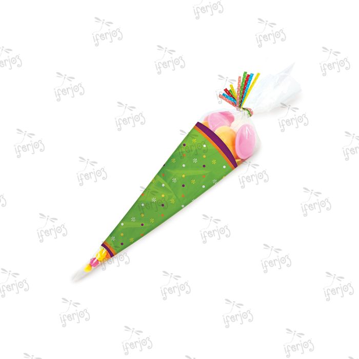 Cono de celofán con papel decorado. Ideal para mesas de dulces en ceremonias, celebraciones y fiestas.