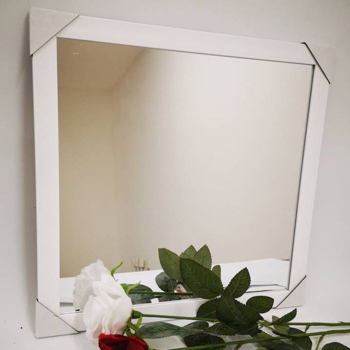 Espejo cuadrado con buena refracción y bordes de plástico resistente que proporcionan elementos utilitarios y decorativos. Con gancho dentado para colgar en la pared.