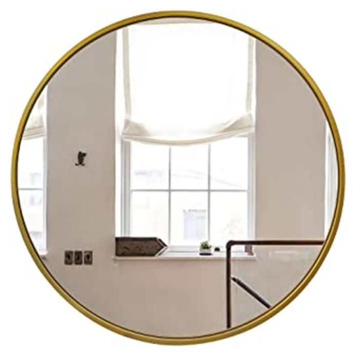 Espejo circular con buena refracción y bordes de metal que proporcionan elementos utilitarios y decorativos.