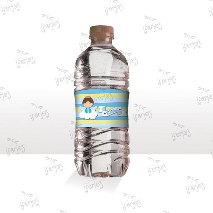 25 Paquetes de Etiqueta Agua Bautizo Angelito Rezando Azul con 10 pzs c/u Tamaño: 22 x 4 cm