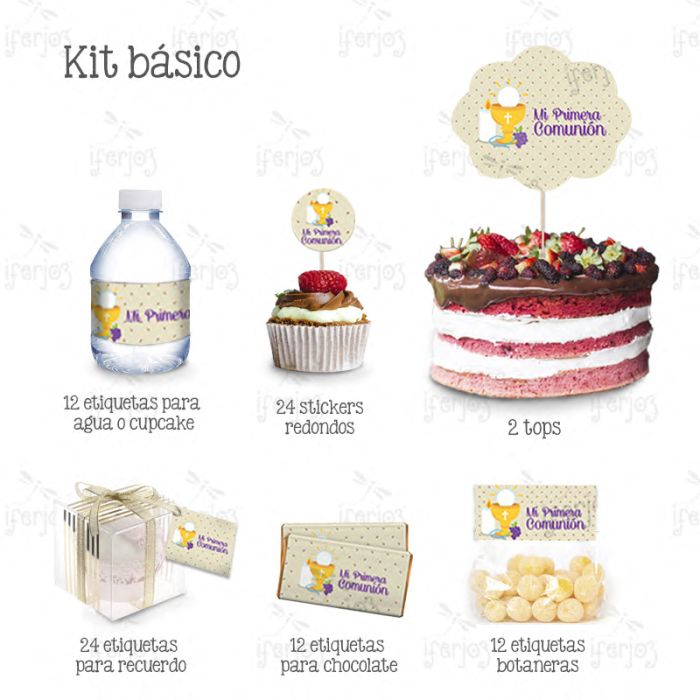 12 Paquetes de Kit Mesa De Dulces Primera Comunión Beige con 24 etiquetas para recuerdo, 12 etiquetas para agua o cup cake, 12 etiquetas para chocolate, 24 Stickers, 12 etiquetas dulceras y 2 tops c/u Tamaño: 2.50 x 31 cm