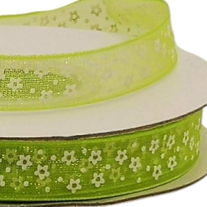 4 Rollos de Listón De Organza Con Florecitas Verde Limón #1.5 9 mm 25 mts c/u