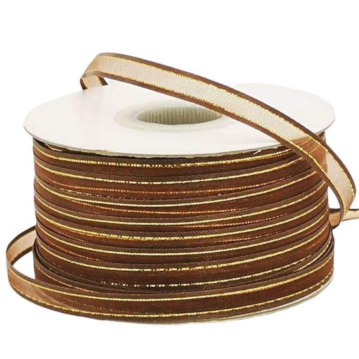 Rollo de Listón de Organza con Orilla Metálica Cafe-Oro #1 con 100 m Ancho:6 mm