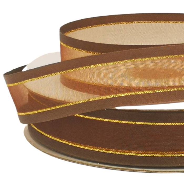 2 Rollos de Listón de Organza con Orilla Metálica Café-Oro #5 con 50 m c/u Ancho:22 mm
