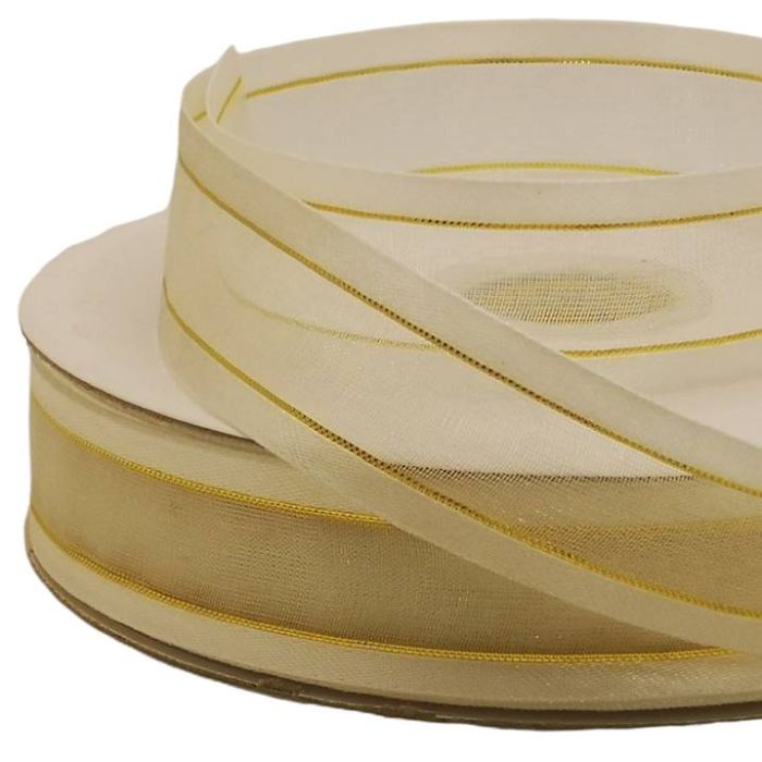 2 Rollos de Listón de Organza con Orilla Metálica Crema-Oro #5 con 50 m c/u Ancho:22 mm