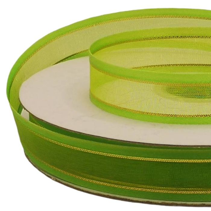 2 Rollos de Listón de Organza con Orilla Metálica Manzana-Oro #3 con 50 m c/u Ancho:16 mm