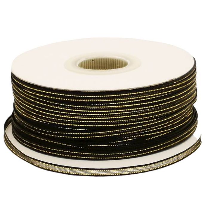 Rollo de Listón de Organza con Orilla Metálica Negro-Oro #0 con 100 m Ancho:4 mm