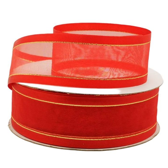 2 Rollos de Listón de Organza con Orilla Metálica Rojo-Oro #9 con 50 m c/u Ancho:38 mm