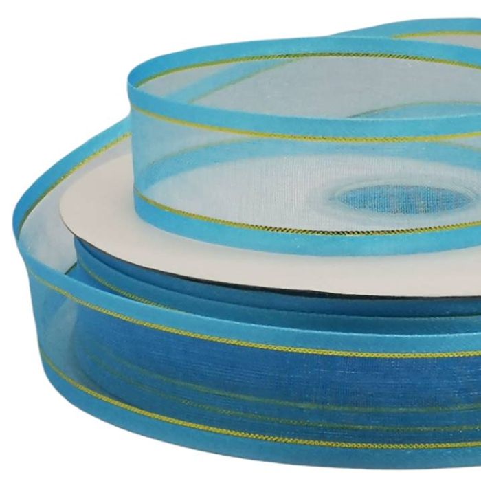 2 Rollos de Listón de Organza con Orilla Metálica Turquesa-Oro #5 con 50 m c/u Ancho:22 mm