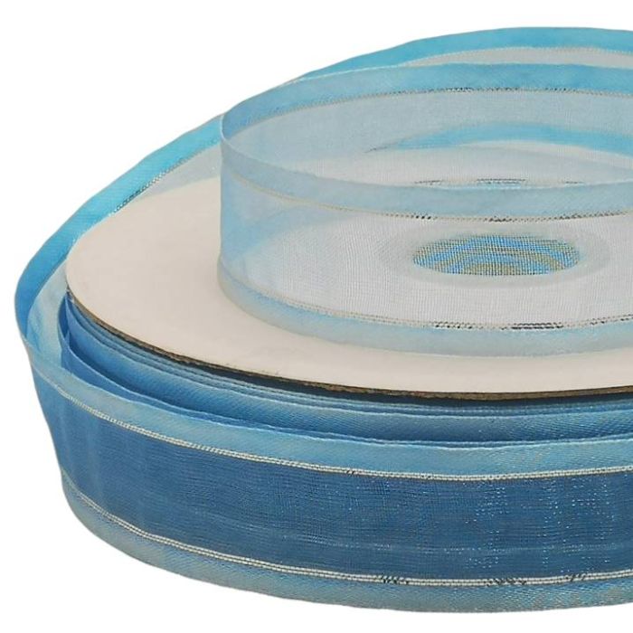 2 Rollos de Listón de Organza con Orilla Metálica Turquesa-Plata #5 con 50 m c/u Ancho:22 mm