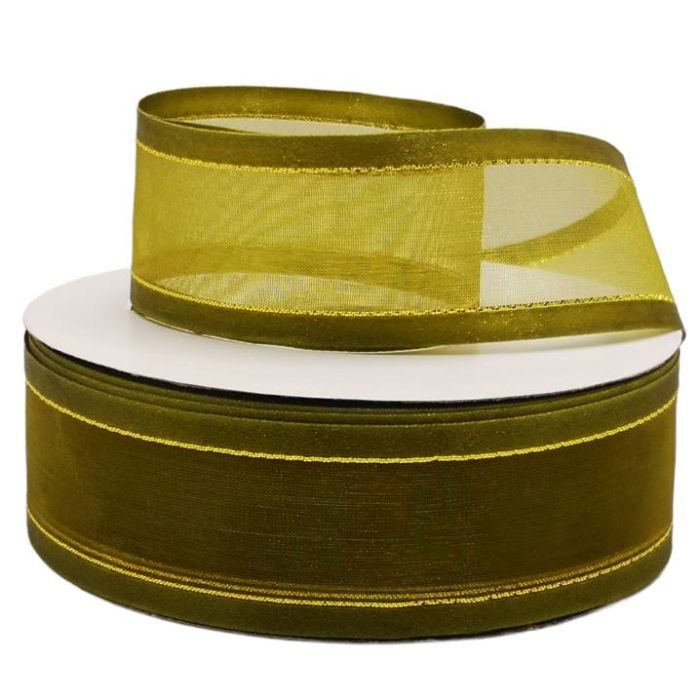 2 Rollos de Listón de Organza con Orilla Metálica Verde Olivo-Oro #9 con 50 m c/u Ancho:38 mm