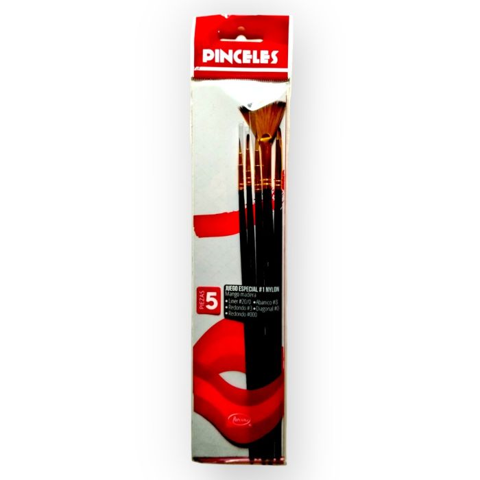 Caja con 24 Sets de Pinceles con mango de madera de 5 piezas c/u. Cada Set incluye: Liners #20/0Redondo #3 y #000Abanico #8Ddiagonal #0