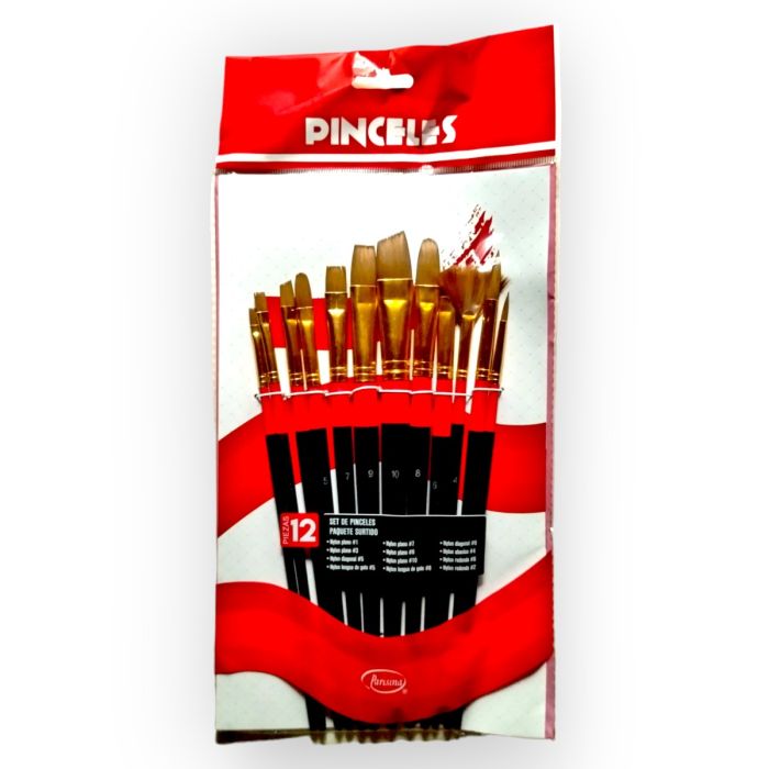 Caja con 6 Sets de Pinceles con mango de madera de 12 piezas c/u. Cada Set incluye: Planos #1, #3, #7, #9 y #10 Diagonal #5 y #6 Redondo #2 y #6 Lengua de Gato #5 y #8 Abanico #4