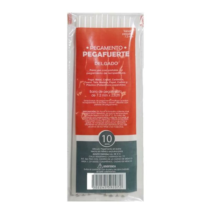 Delgado pegafuerte de 7.5 mm. de diametro y un largo de 23 cms. es un adhesivo termoplastico de alto desempeño que se adhiere a superficies de dificil pegado (metal, cristal etc.) diseñado para derretirse usando pistolas para su aplicación.