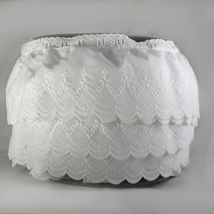 Esta es una tira de popelina de poliéster y algodón, con delicados bordados y plisada. También con resistente pasa cinta que hará que tus proyectos sean únicos y divertidos.