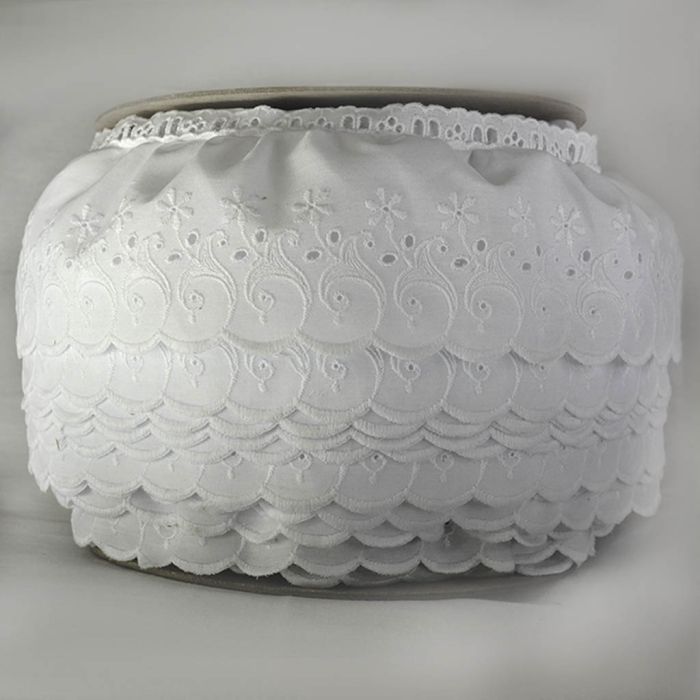 | Description | Esta es una tira de popelina de poliéster y algodón, con delicados bordados y plisada. También con resistente pasa cinta que hará que tus proyectos sean únicos y divertidos. Adorno para todo tipo ropa, en especial vestidos de novias, comunión, quince años. Además de calzado, lencería, trajes regionales, bolsas, manualidades, cortinas, bambinetos, toallas, fundas, decoraciones de navidad o día de muertos, vestidos para niño Dios, etc. |