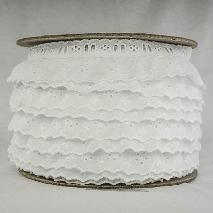Esta es una tira de popelina de poliéster y algodón, con delicados bordados y plisada. También con resistente pasa cinta que hará que tus proyectos sean únicos y divertidos.